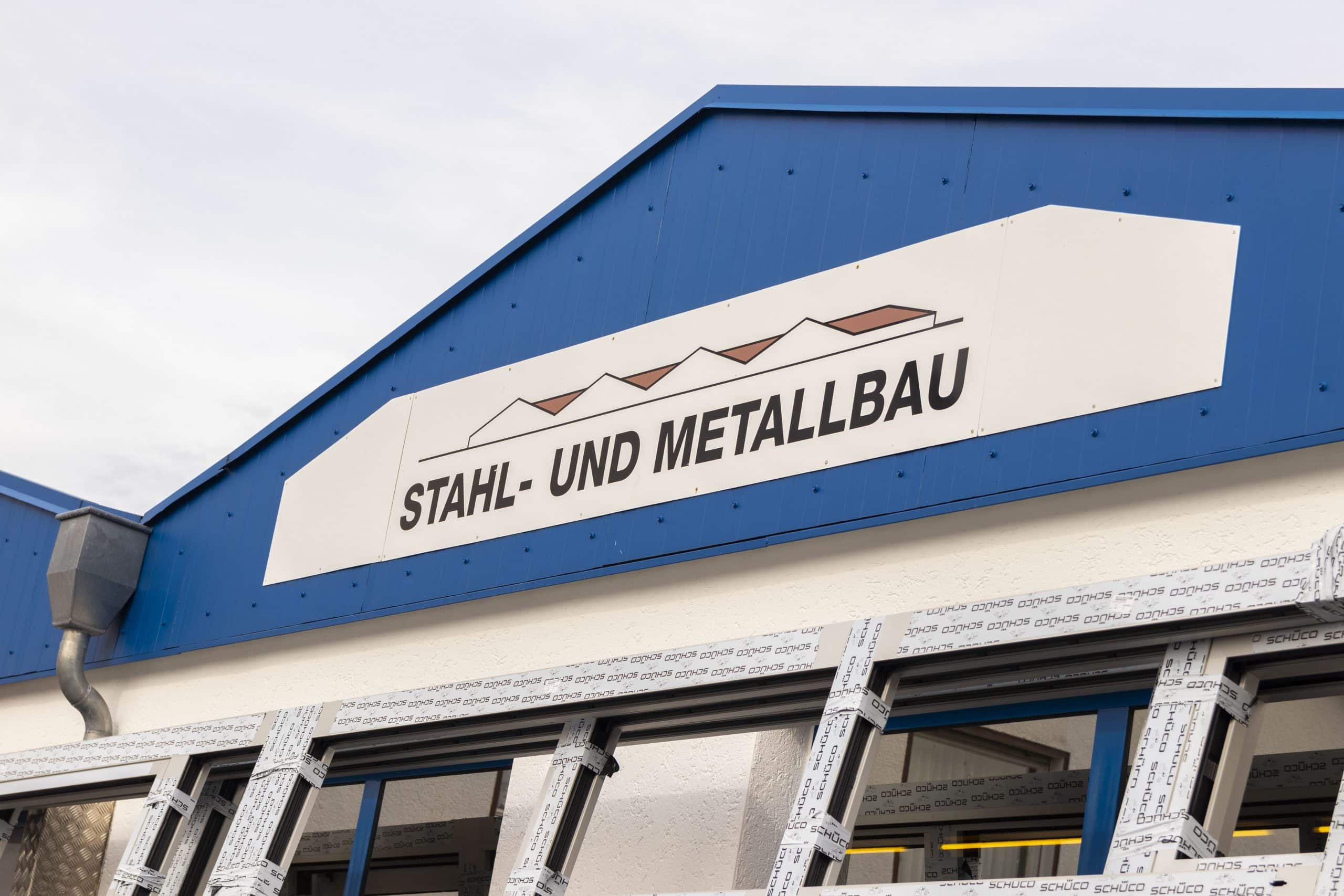 Schüco-Fassade, Stahl-Vordach + Stahltüren